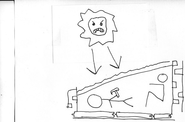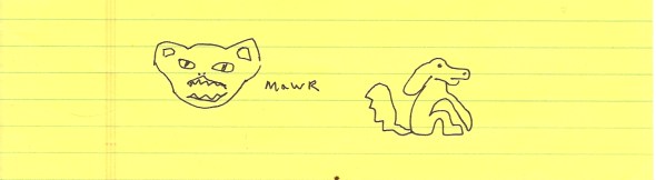 I made this page just to study for myself any connection there might be between my earliest pre-school masterpieces, and whatever else I’ve done along these lines. The big ‘studio’ that existed was the floating world of my time as a student, during which I relentlessly doodled over my textbooks and in the margins of my notes. My drawing skill then peaked when I was in University and has declined since my graduation in 1991. These are basically mostly doodles. My favorite work from my senior year is lost, and I hope I’m not implying that this is a great tragedy, though to me, it almost is. It would have been even sweeter to have created more, and this was an era when comics came into their own, and some people I knew did go into comics. I published a compendium of this era of comic work among my peers for two years as an undergrad. But I had too much on my plate to stick with drawing. Only when I was imprisoned in a classroom could I consistently work at it. I was crazy to do film, and I began writing songs, and… We’d have to get into a discussion about our finite nature and the attitudes native to youth to really unravel it. Nevertheless, I can still draw something that makes me laugh, that captures what I am going for, even though I can see all the soft dross that those who really work at it can dispense with much more easily than I. And most of the drawings here are exactly that- not ever intended or conceived as a finished work, but more of a note of an idea I was trying to communicate.